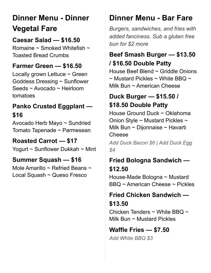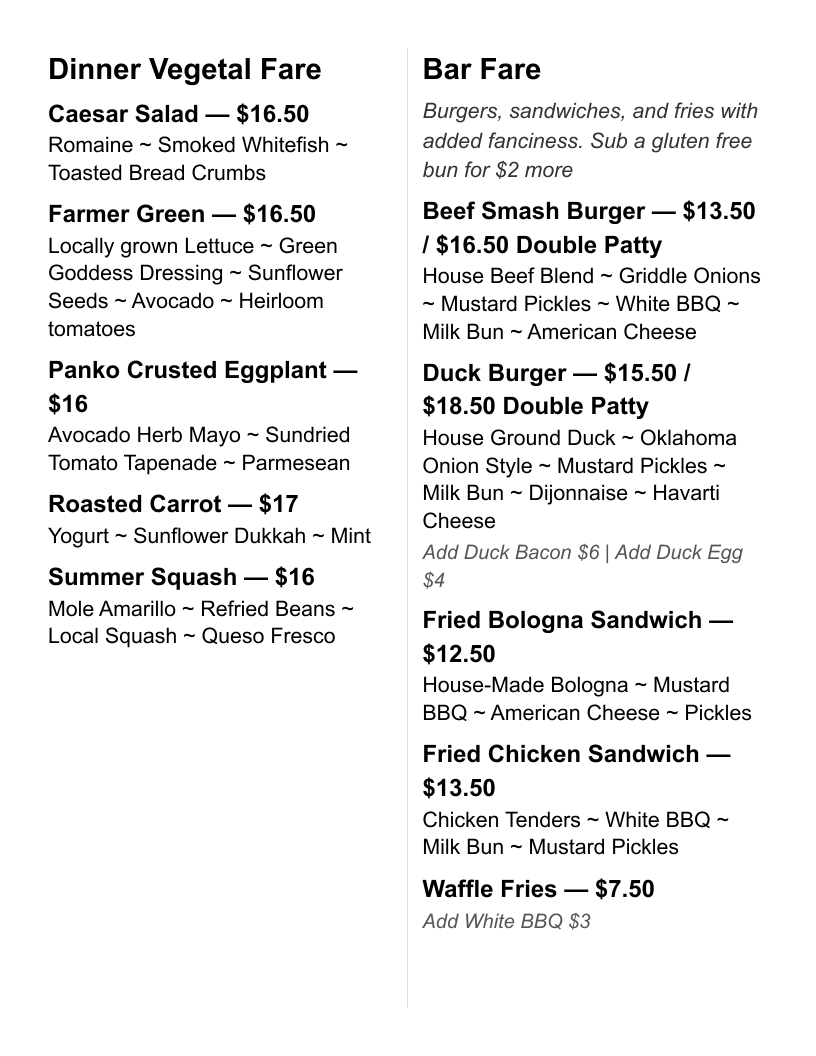 House Ground Duck ~ Oklahoma Onion Style ~ Mustard Pickles ~ Milk Bun ~ Dijonnaise ~ Havarti Cheese. Add Duck Bacon $6